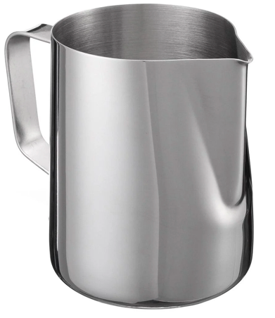 Питчер из нержавеющей стали и с острым носиком. С таким получится взбить молоко и аккуратно влить его в эспрессо.